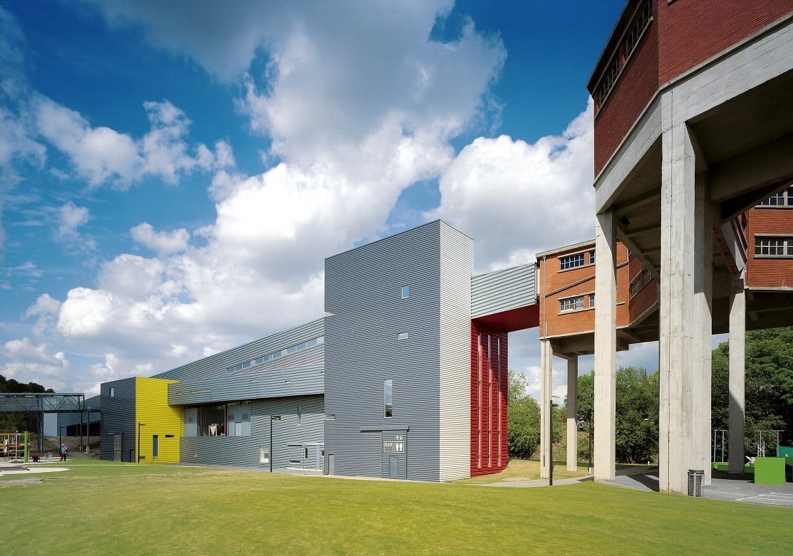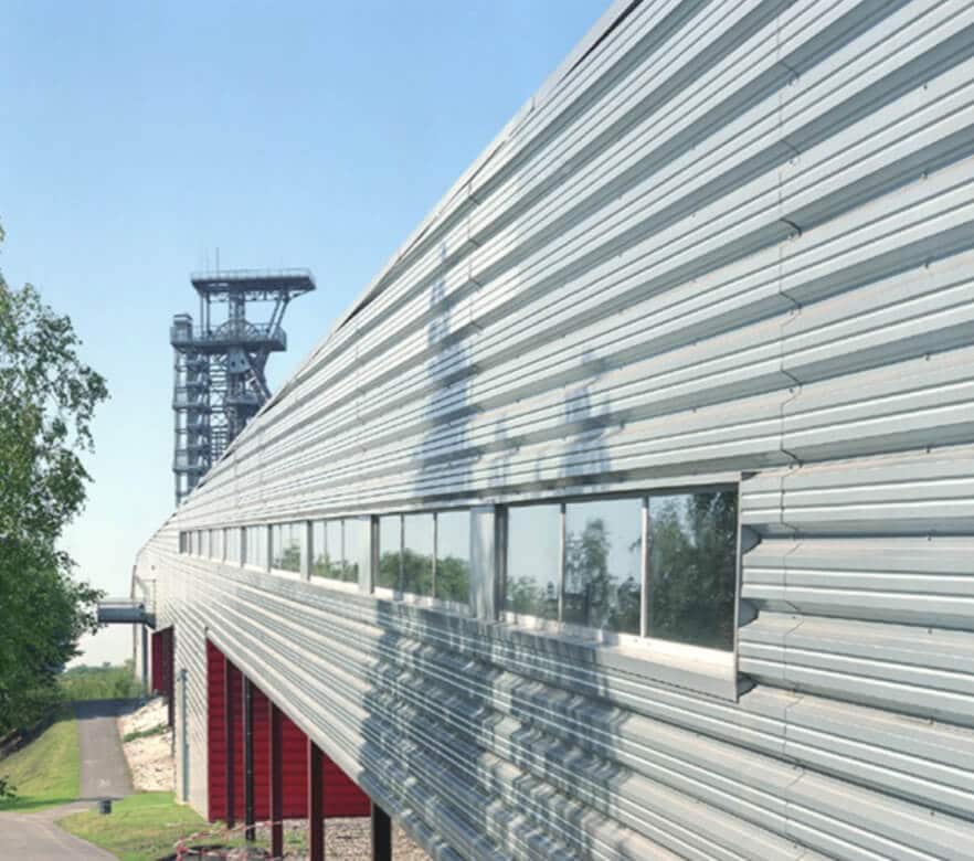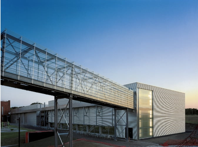 L’architecture industrielle des années 50 a produit des bâtiments spectaculaires dont certains, le Belvédère, le Châssis à molettes et la Salle des machines, sont classés comme patrimoine depuis 1989. Jean Nouvel les a intégrés au coeur d’un projet contemporain empruntant les codes et les matériaux des constructions industrielles. En créant la passerelle de 210 mètres de long, qui distribue vers l’ensemble des espaces du SPARKOH!, il s’inspire du fonctionnement de l’ancien charbonnage. Un trait d’union symbolique entre passé et présent. L’architecte Laurent Niget poursuit par la suite le programme de construction du SPARKOH!.