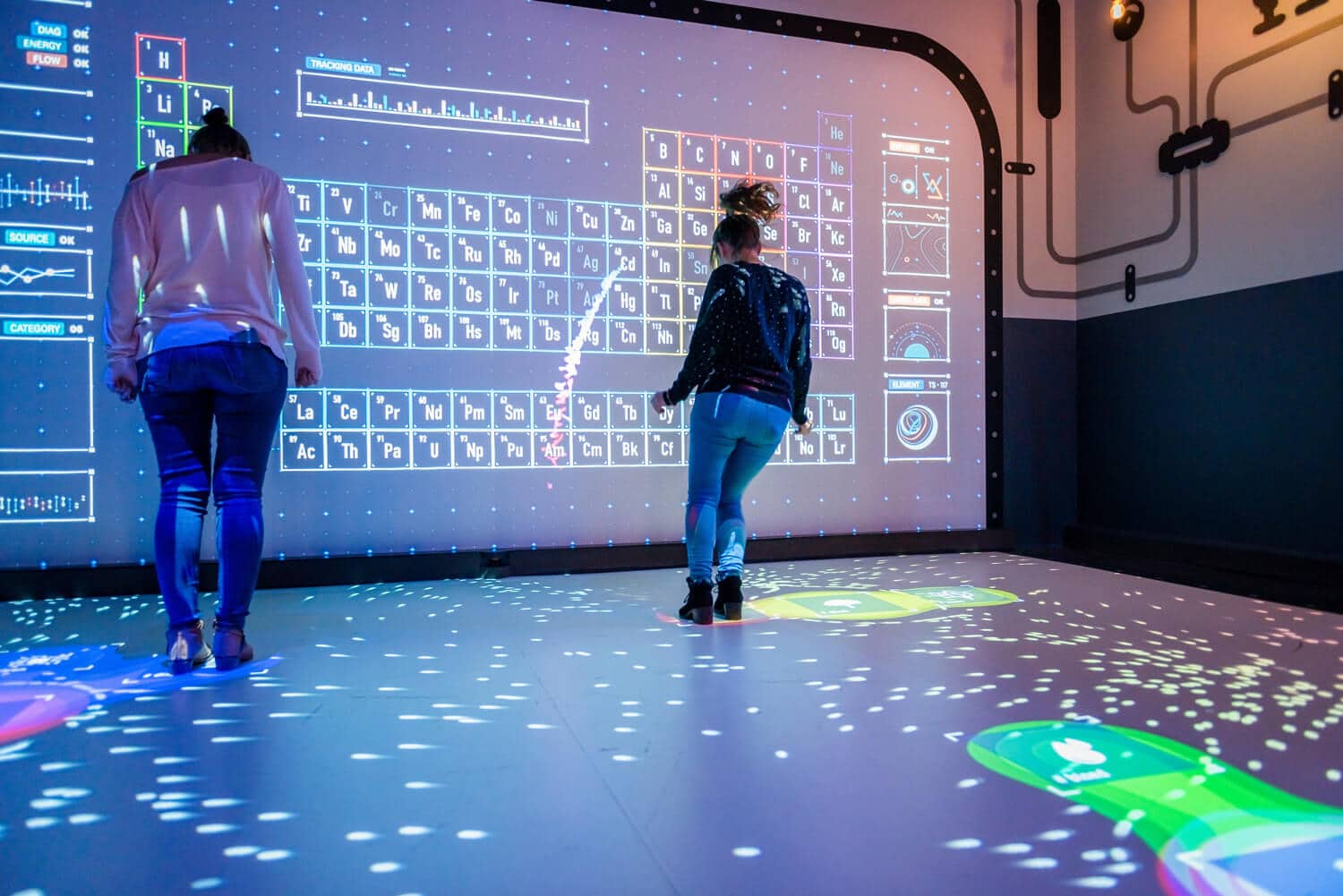 Pour atteindre le tableau périodique des éléments chimiques, direction le Pass’âge des Aventuriers, la zone des 6-12 ans. Pour y arriver, traversez le couloir des inventions : éclairage black light et fresques murales de type jeu « où est Charlie » – la traversée est déjà une expérience en soi.