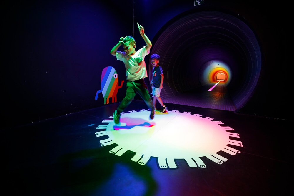 Danser avec la lumière, écrire avec la lumière, raconter une histoire en ombres chinoises, faire de la musique… dans cet espace de jeux pour les 3-7 ans, les enfants découvrent les notions d’ombre, de lumière, de couleur et de transparence avant d’entrer dans l’incontournable « tunnel arc-en-ciel ».