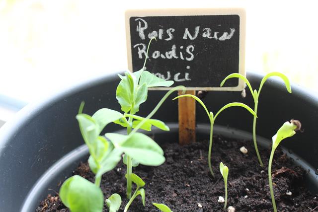 Mini potager gros plan sur les pousses de pois et de radis
