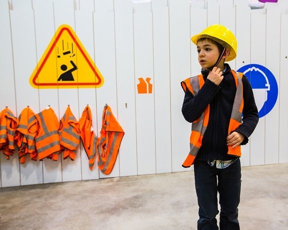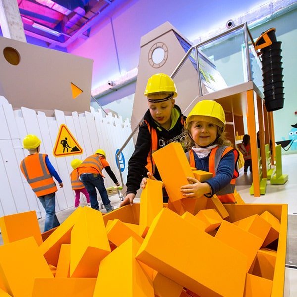 Een bouwspel op ware grootte waarbij de kinderen samen een groot huis bouwen met stenen in schuimplastic. Ze zijn om beurten architect, ingenieur en metselaar in de dop en leren zo hoe zich te oriënteren in de ruimte. Iedereen werkt samen als een team.