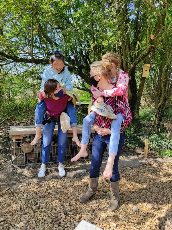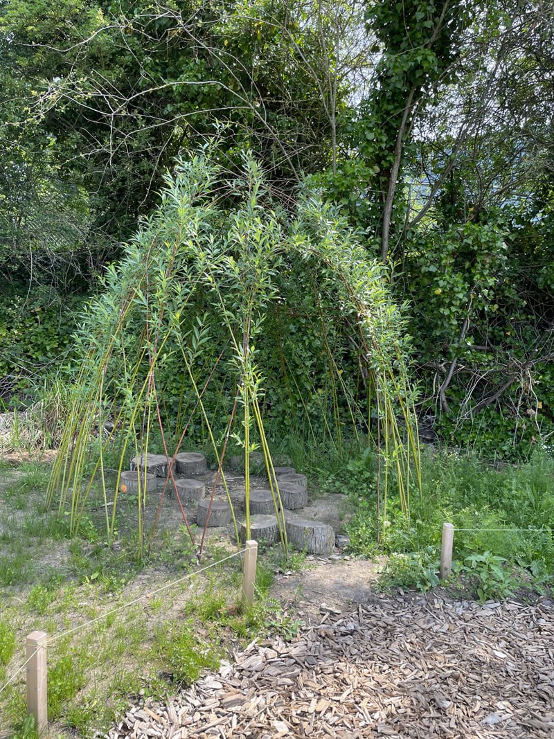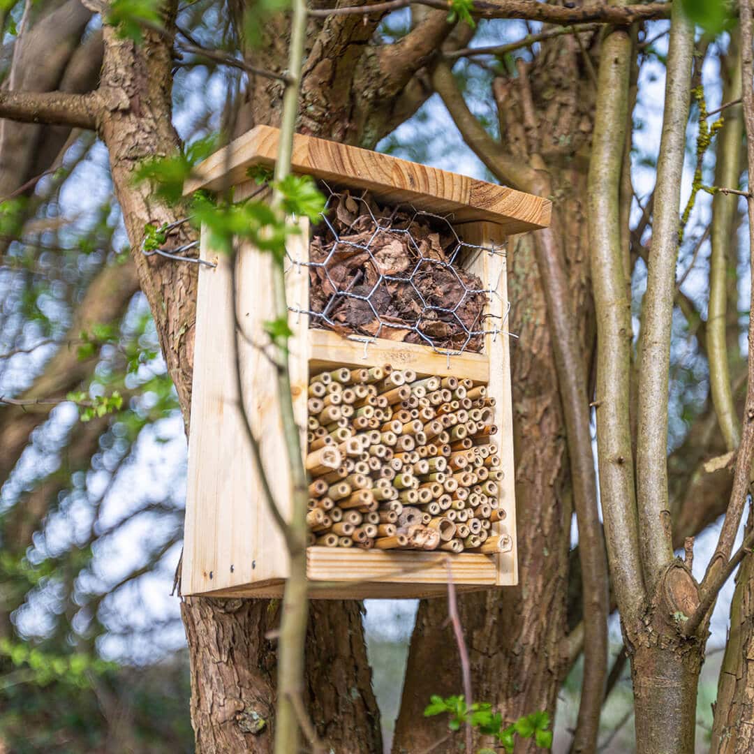 De mens staat centraal in de Tuin van de Biodiversiteit! Zie je deze hutjes van wilgenhout? Ze werden zorgvuldig met de hand gevlochten door onze abonnees! En de vogelhuisjes en insectenhotels die je hier ziet hangen? Dat is het resultaat van het werk van onze stagiaires. Ze maakten zelf deze schuilplaatsen met behulp van hun hamers! En de voetsporen van dieren op de grond? Het opvullen van het blotevoetenpad? De aanplanting van struiken? De teams van het Pass en het publiek hebben hun krachten gebundeld met de kostbare hulp van BLOC PAYSAGE, de landschapsarchitecten van de Tuin van de Biodiversiteit.